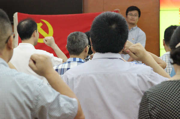 会后,全体党员干部在党旗下重温入党誓词,庄严宣誓。(组织人事处)