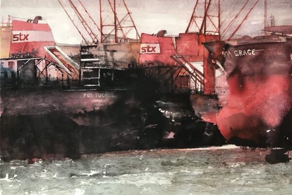 李莉老师的水彩画《船——既》以红色为主调,以色彩的浓淡、明暗的对比凸显主体,构图乱中有序,用灵动的笔触勾勒出船的千姿百态,极富动态。作品生动形象地体现了舟山海岛的独特寓意,饱含了对海岛深厚的情感,具有独创性,彰显个人艺术特色。